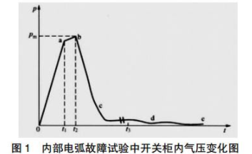 壓縮階段。0~t1時間內,柜體內部產生電弧到泄壓裝置通道口排出。設在t=0時柜體內部出現強大功率電弧,故障室內的壓力上升很快。內部故障電流越大,電弧電壓越高,隔內體積越小,則壓力上升越快。直到排氣口打開,這一階段才結束,持續的時間大約為5~10ms。