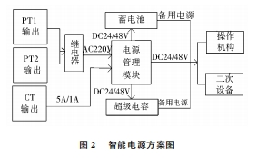 組織、操控器、通訊終端等二次設備都需求完成不間斷供電。為了進步供電的牢靠性,要求在供電電源失電時,二次回路仍然會有電源,可以持續牢靠的動作,環網柜中有必要具有備用電源。為了進步供電電源的牢靠性本電源的規劃首要選用了如下方法:(1)環網柜一般選用雙進線,兩條進線互為備用給電源的充電模塊供電,當其中一條進線失電時,由繼電器將另一條進線的220V電源轉給充電模塊,保證整個柜子的二次回路持續供電。(2)當環網柜的兩條進線都失電的時分,為了使二次回路持續帶電,需求由備用電源持續供電。現在首要的備用電源是不間斷電源(UPS)和蓄電池,還有的選用超級電容供電。為了進步供電的牢靠性,本電源計劃選用蓄電池與超極電容相結合,兩種電源可互為備用,可以進一步進步供電的牢靠性。智能電源的計劃如圖2所示。