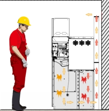 壓力經過后部通道上部釋放出來,氣流出來后沿著箱頂部走,氣流已經過長距離的活動,燃燒火焰及沖擊力已明顯減小,對設備和人員的傷害較小,防止釋放到電纜溝對電纜的損壞,或氣箱電弧壓力直接從頂部釋放到開關室頂部反彈,直接損傷柜前人員,或反彈進一步燒損其它設備。