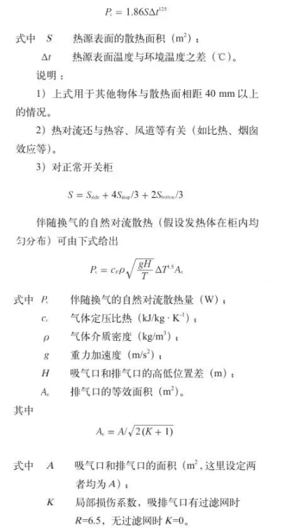(2)熱對流是物體表面與相接觸的流體間有溫差時呈現的傳熱現象。柜體表面、氣箱表面或熱源表面的天然對流散熱可用下式預算
