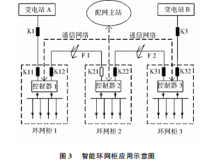 的區(qū)段,兩邊都能或者都不能檢測到故障信號的區(qū)段則不是故障線路,所以可快速容易的將故障點(diǎn)定位在K12和K21之間。開關(guān)K12會跳閘,開關(guān)K21保持分閘狀態(tài)并閉鎖,將故障區(qū)段切除。配網(wǎng)主站接收到隔離成功信息,通過調(diào)度自動化系統(tǒng)將開關(guān)K11合閘,恢復(fù)非故障區(qū)域供電。同理,當(dāng)在F2處發(fā)生故障時,集中式智能控制器將采集到的故障信號傳輸?shù)脚渚W(wǎng)主站,配網(wǎng)主站對故障信號進(jìn)行分析和邏輯判斷。通過故障點(diǎn)處在兩邊感受到信號不通的區(qū)段的判據(jù),將故障定位在K22和K31之間。開關(guān)K3會跳開然后自動重合,開關(guān)K31、K22跳開后不再閉合,將故障區(qū)段切除。配網(wǎng)主站接收到隔離成功信息,通過調(diào)度自動化系統(tǒng)將開關(guān)K21合閘,恢復(fù)非故障區(qū)域供電。在整個過程中,從發(fā)現(xiàn)故障到故障隔離最后將非故障區(qū)域恢復(fù)供電所需要的時間非常的少,能夠最大限度的提高供電的可靠性,這是采用智能環(huán)網(wǎng)柜的優(yōu)越性所在